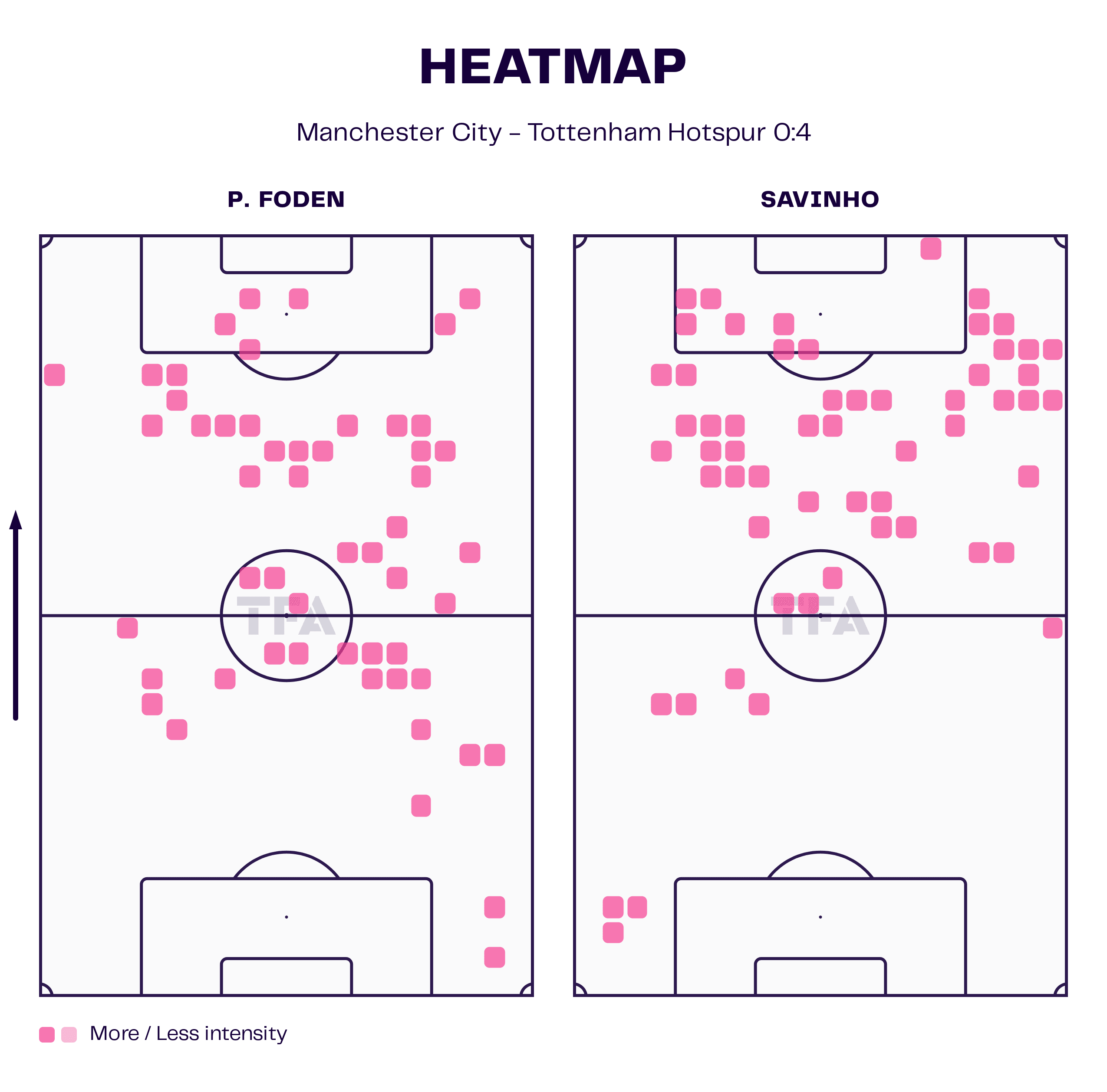 Under Guardiola, Manchester City have typically employed wide forwards who cut inside, creating space for overlapping full-backs and facilitating intricate passing combinations in central areas. However, in the game against Tottenham, Guardiola opted for a more narrow attacking formation, with Phil Foden and Savinho operating as inverted forwards behind Erling Haaland.
