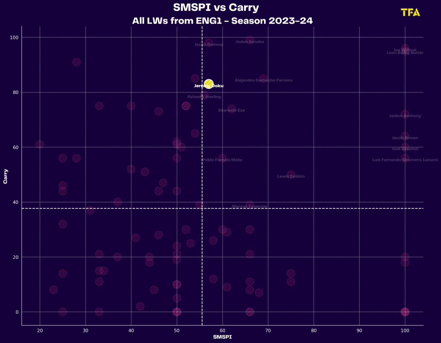 The above visual indicates a player’s capability to play forward passes and carry the ball upfield. Those proficient in both are instrumental in moving the ball from defensive to attacking zones, breaking lines and driving the team forward. Doku knows how to carry the ball but lacks in making forward runs. The reason behind this is City’s high attacking line. Doku receives the ball in the final third and his purpose is to carry the ball into the penalty box.
