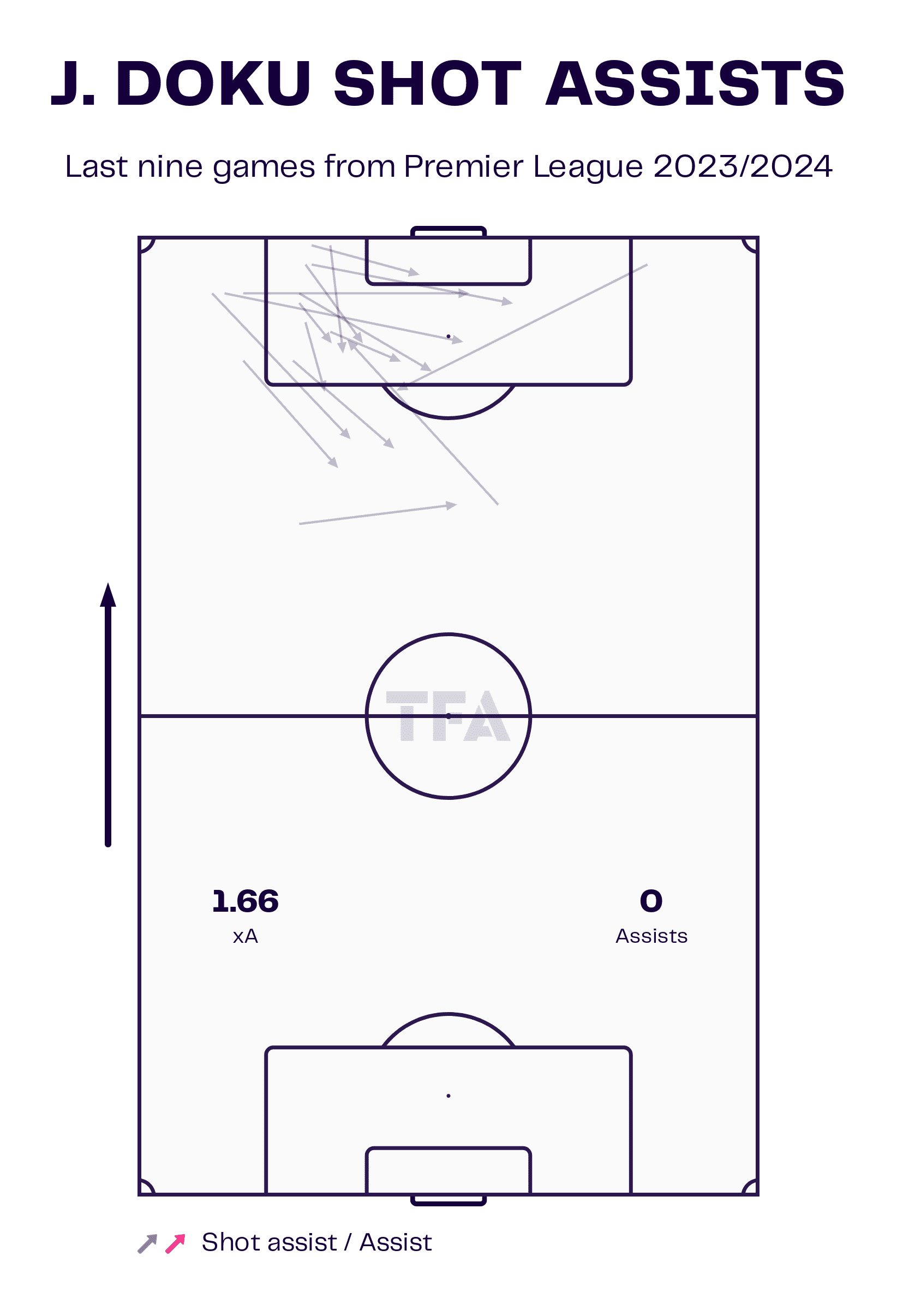 Despite getting into dangerous areas and attempting a lot of passes into the box, Doku has failed to create a single goal in the last nine league games. Most of the shot assists made are cutbacks and landed in dangerous scoring areas. This is a frustrating sign for any player. Jeremy Doku is on the ball most of the time and he is the one creating continuous threats.
