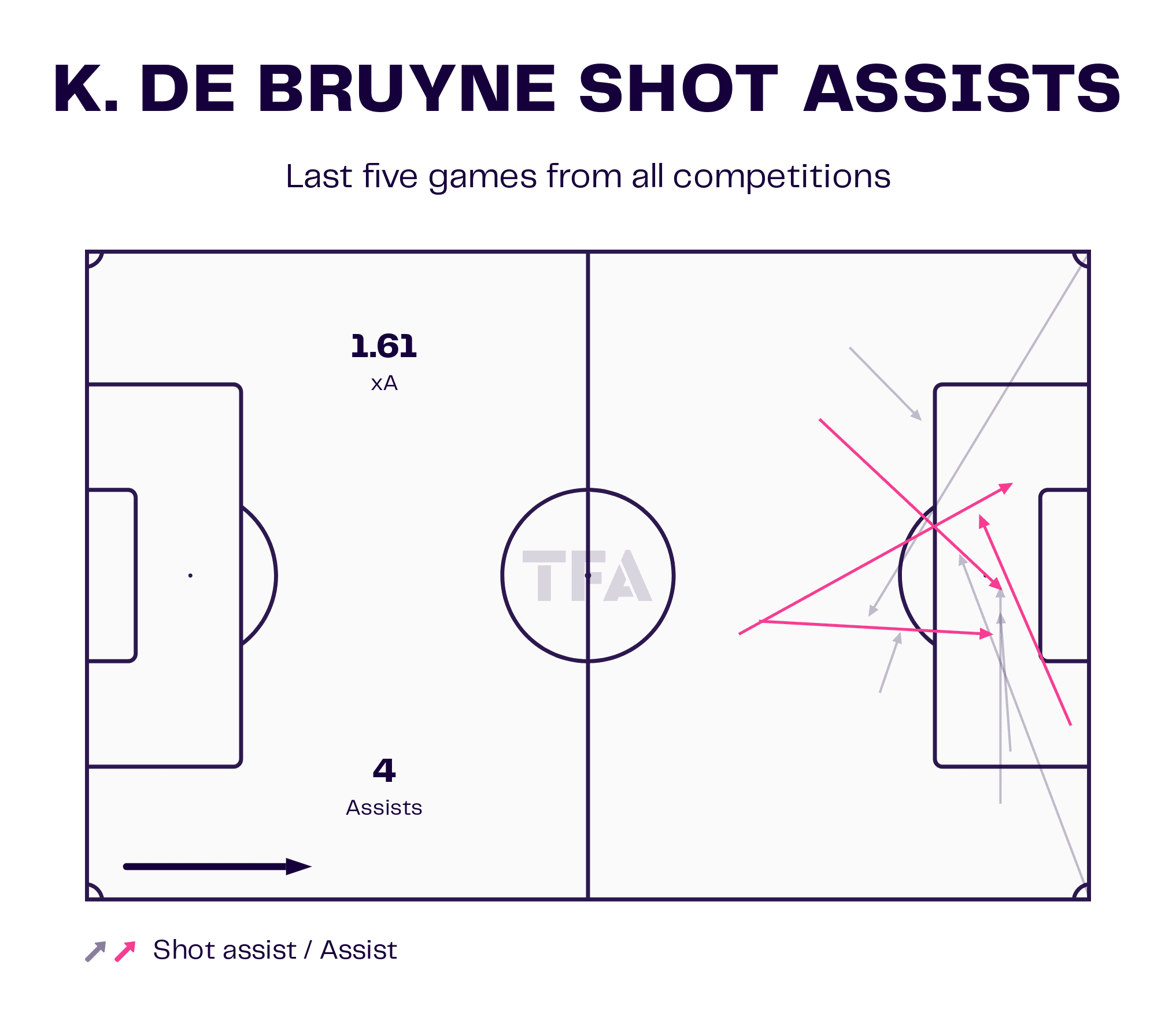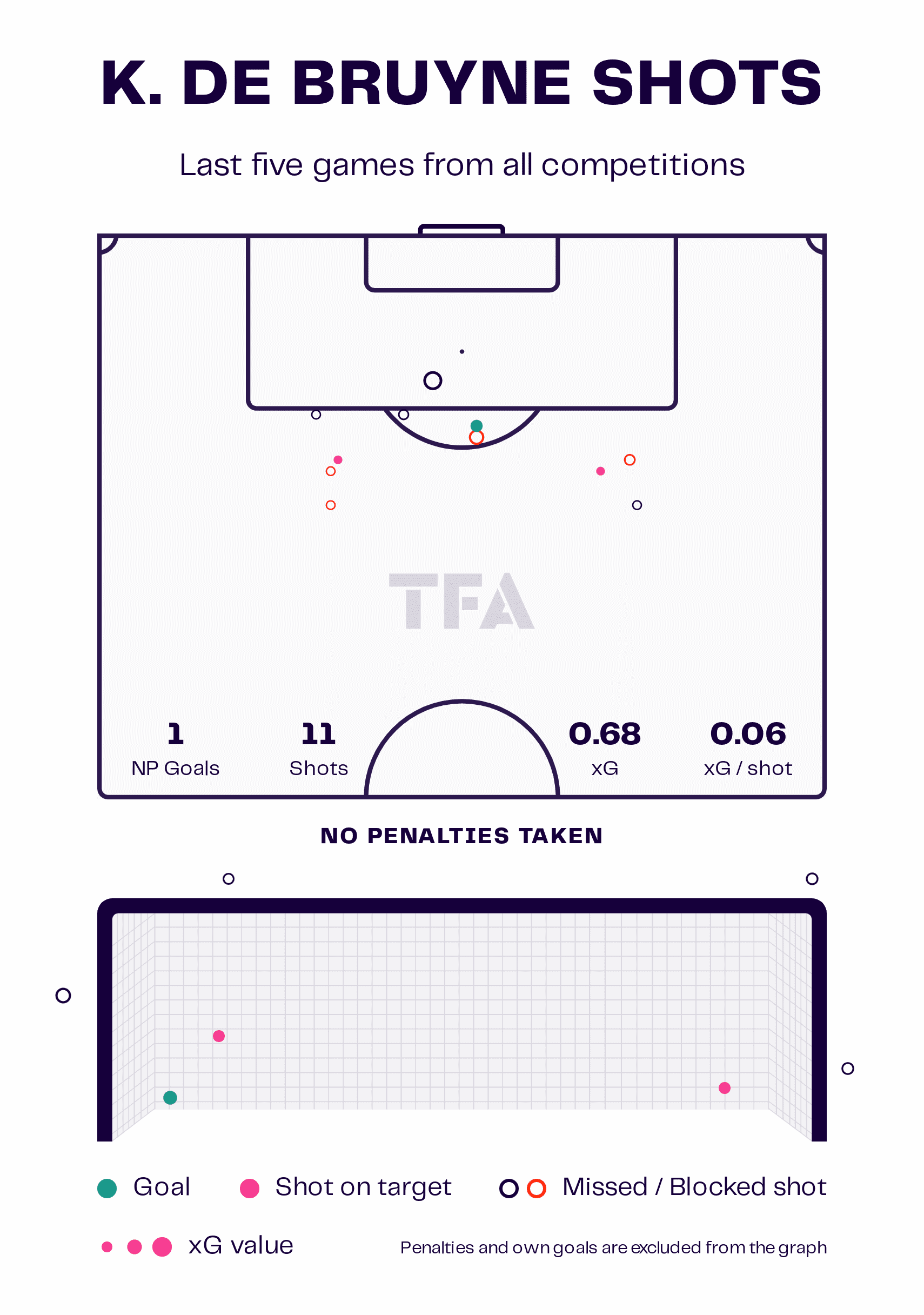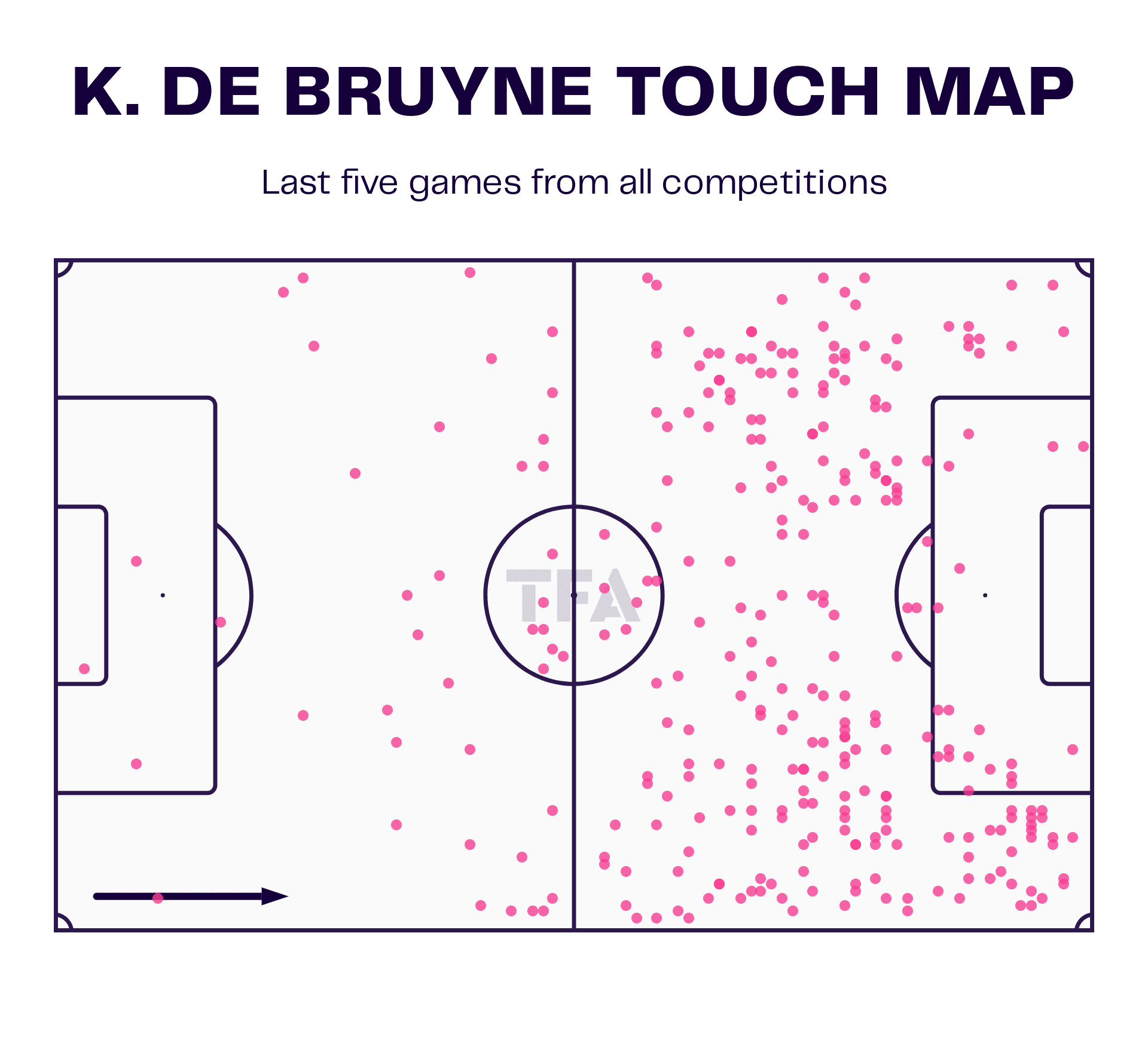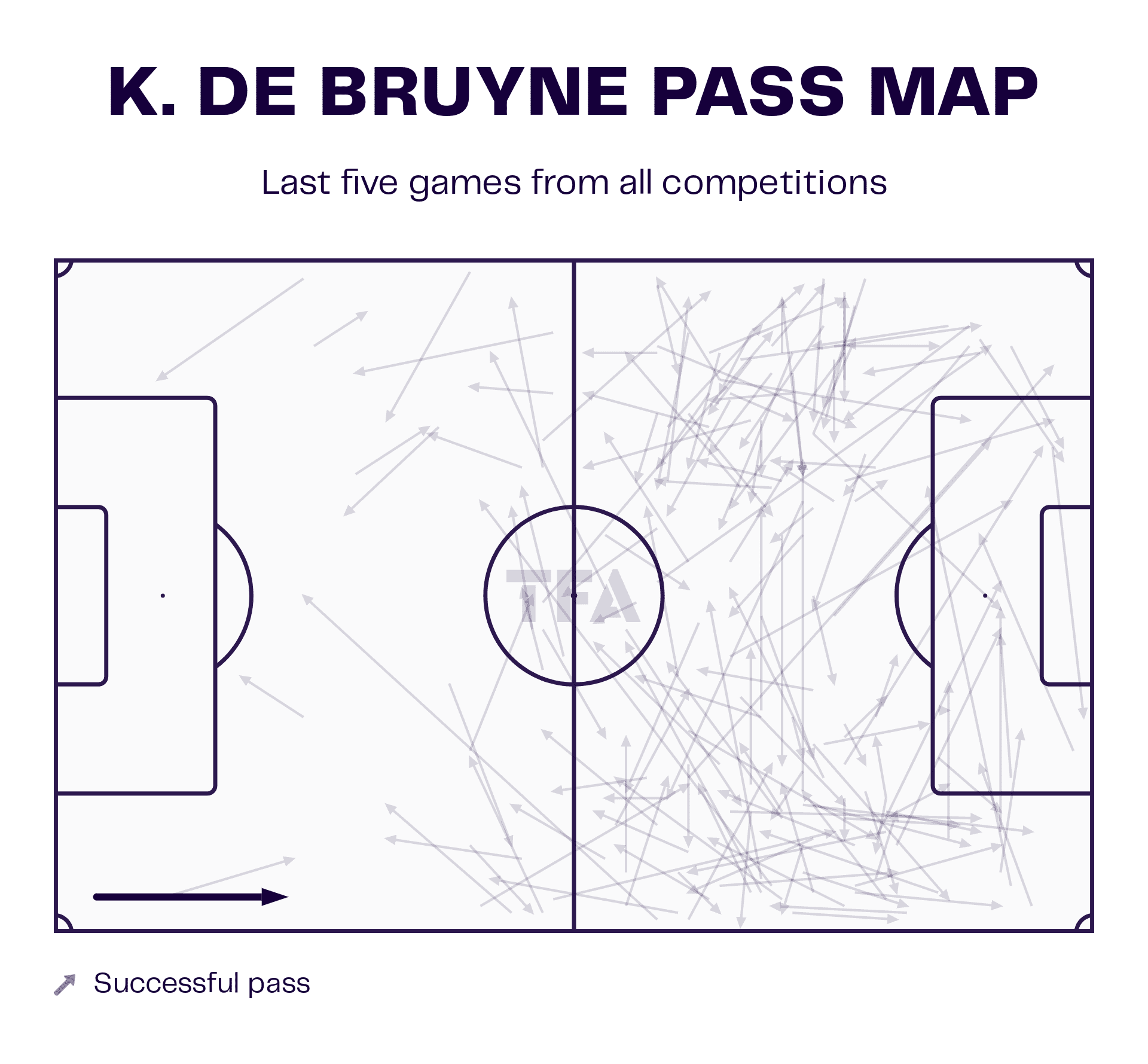 These two visuals show the pass map of the Belgian as well as the crosses attempted by him in the last five matches in all competitions. Kevin has averaged 10.5 passes to the opposition penalty box per 90 minutes. These are big numbers for any attacker. Most of De Bruyne’s passes are directed towards the penalty spot.