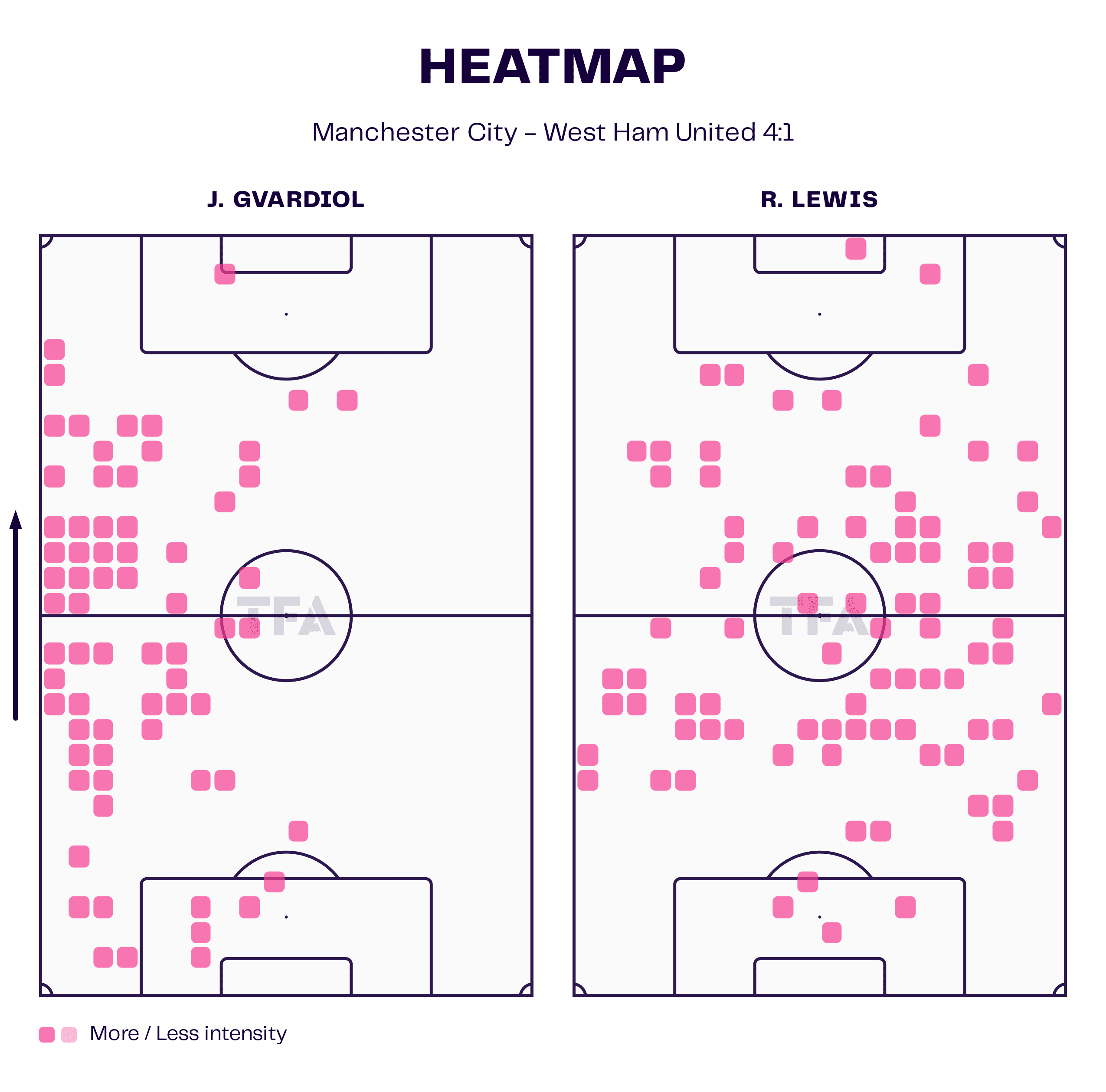 Faced with West Ham’s disciplined defensive setup, Manchester City initially probed for weaknesses, patiently circulating the ball and seeking openings. They utilized their fullbacks, Gvardiol and Lewis, to provide width, stretching West Ham’s defence horizontally.