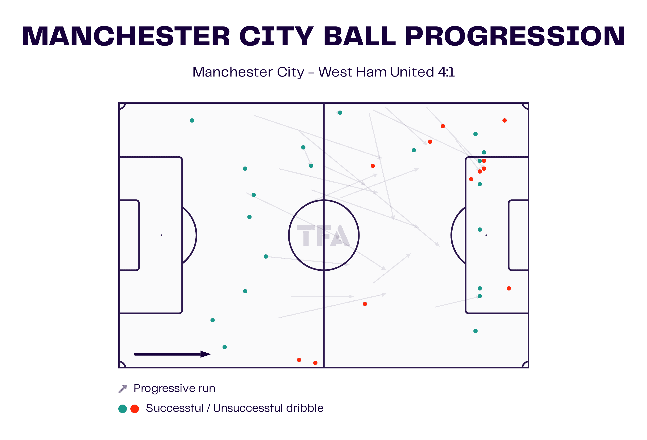 To break down West Ham’s compact defensive block, City emphasized quick passing and intricate movement. They increased the tempo of their passing, looking to disorient the opposition and create gaps through rapid ball circulation. The interplay between De Bruyne, Bernardo Silva, Foden, and Savinho was crucial, as they exchanged quick passes and interchanged positions to disrupt West Ham’s defensive organization.