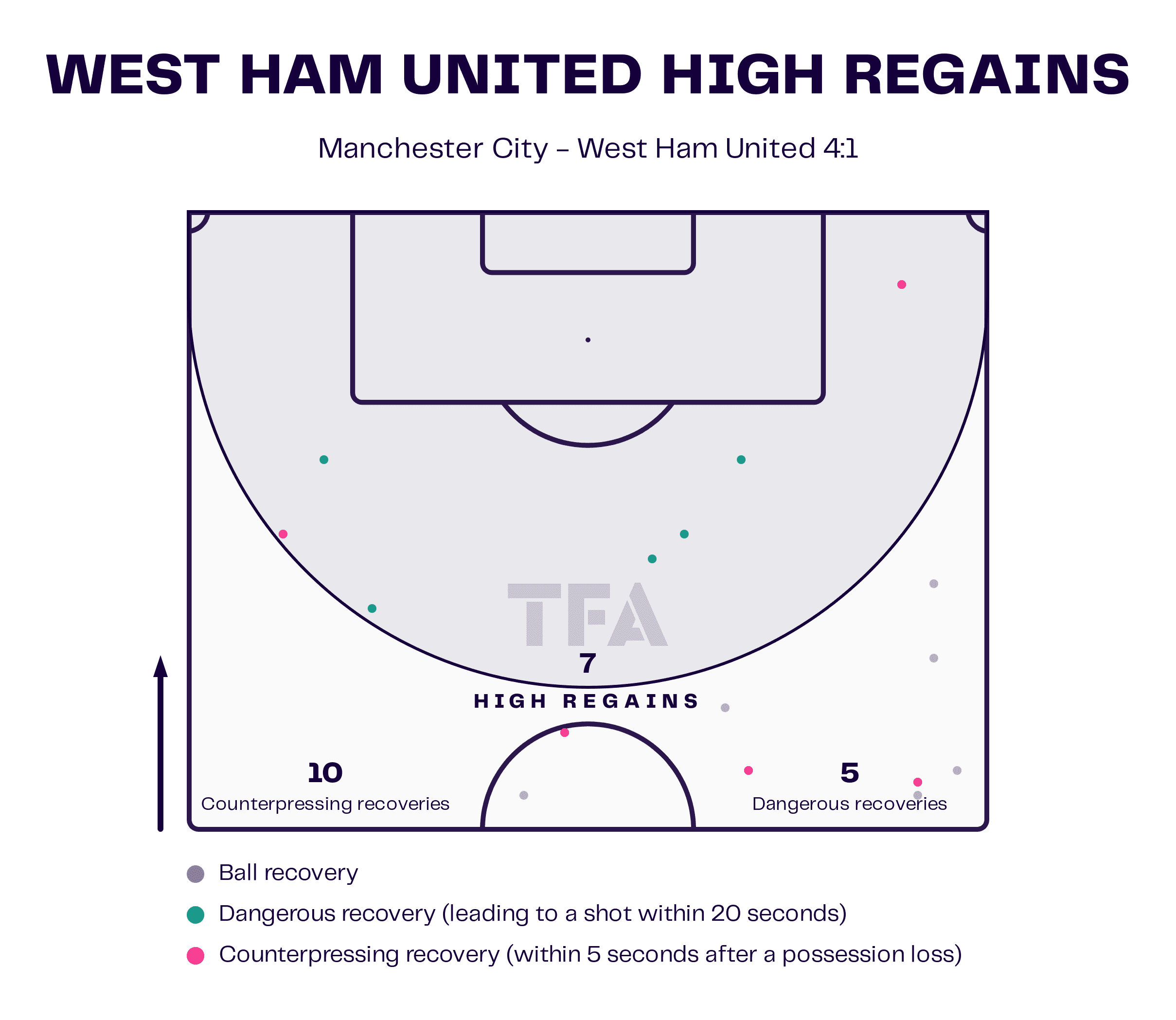 - Counter-Pressing: When possession was lost, West Ham engaged in aggressive counter-pressing, attempting to win the ball back immediately and disrupt City’s build-up play.