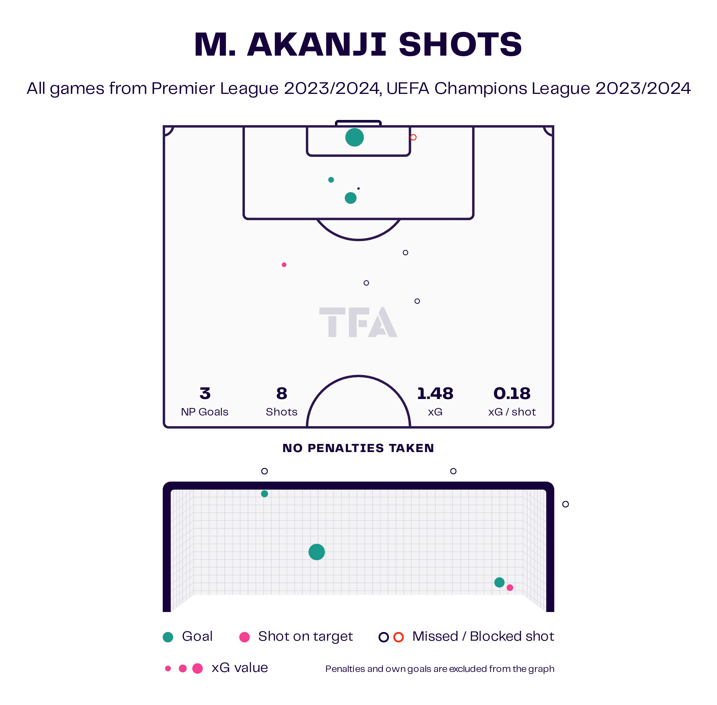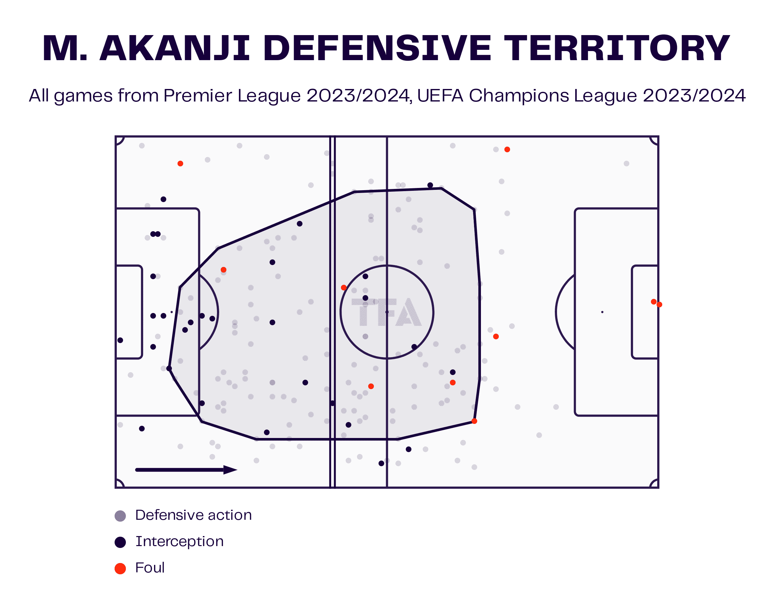 Manuel Akanji’s versatility has allowed him to cover plenty of areas on the field and allowed him to win the ball in different areas on the field. The defender is strong in the air and goes hard for ground-level duels. Akanji has won 67% of his defensive duels, 76% of his loose ball duels and 55.6% of their aerial duels. Other than this, the 28-year-old defender makes around 3.6 interceptions per 90 minutes, with most of these coming inside the opposition penalty box.